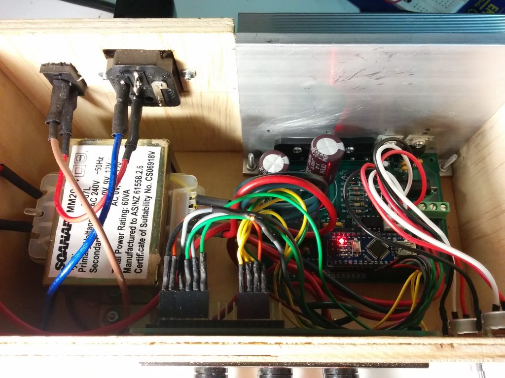 The enclose us mostly complete with the transformer, PCB, heatsink, mains input and front panel items all installed. It just needs a top for the box, a coat of paint or lacquer and some knobs for the pots to finish it off.