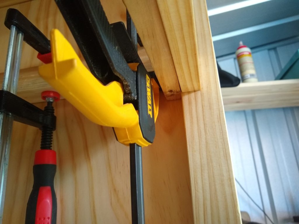 The body is composed of 2 frame and panel pieces on either side, with simple rails running across the front and the back to tie them together. Mortise and tenon joints are used throughout, and the panels in the sides are tongue and grooved and floating in the side frames. The base of the shelf is made of solid pine laminated into a board. The legs are 2 laminated 19mm thick pieces to be roughly 38x38mm.